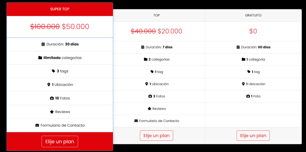 Debes Seleccionar el tipo de plan que deseas contratar entre gratuito, Top (7 Días) o SuperTop (30 Días)